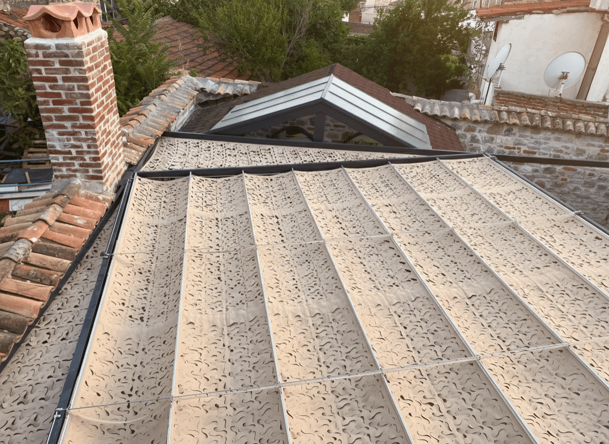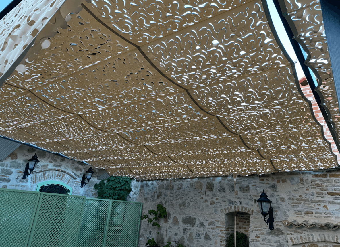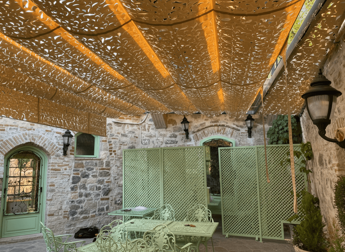 Küçükköy’ün Tarihi Avlusunda Bir Gölge Sanatı: Zeljanik Cafe Ayvalık’ ın sanat köyü Küçükköy’ de, Zeljanik Cafe’ nin tarih kokan avlusunu Selçuk Tente’ nin "harika gölge" anlayışıyla taçlandırdık. Taş duvarların samimiyetine ve köyün sanatsal ruhuna eşlik eden çözümümüz: Telli Tente Sistemi. Bu butik uygulamada, Küçükköy’ ün doğal dokusuna ve mekanın ferforje mobilyalarına kusursuz uyum sağlaması için CNC Kesim Kamuflaj Kumaş tercih ettik. Krom halatlar üzerinde süzülen sistem, Ayvalık güneşini sanatsal birer ışık huzmesine dönüştürerek taş duvarlar üzerine masalsı desenler bırakıyor. Fotoğraflarda göreceğiniz gibi; kamuflaj doku, mekanın mint yeşili kapıları ve antik fenerleriyle birleşerek misafirlere sanki asırlık bir çınarın altındaymışçasına huzurlu ve estetik bir atmosfer sunuyor. Tarihin gölgesinde, sanatın tam merkezinde bir Ege molası.