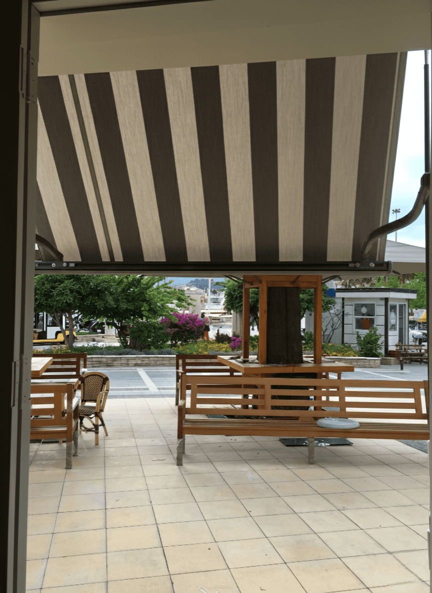 • Dikey Eğim ile Tam Koruma: Yan kolların dairesel hareketiyle yukarıdan aşağıya doğru 180 dereceye kadar inebilen mekanizma, özellikle öğleden sonra denizden yansıyan yatay güneş ışınlarını misafirleri rahatsız etmeden filtreler.