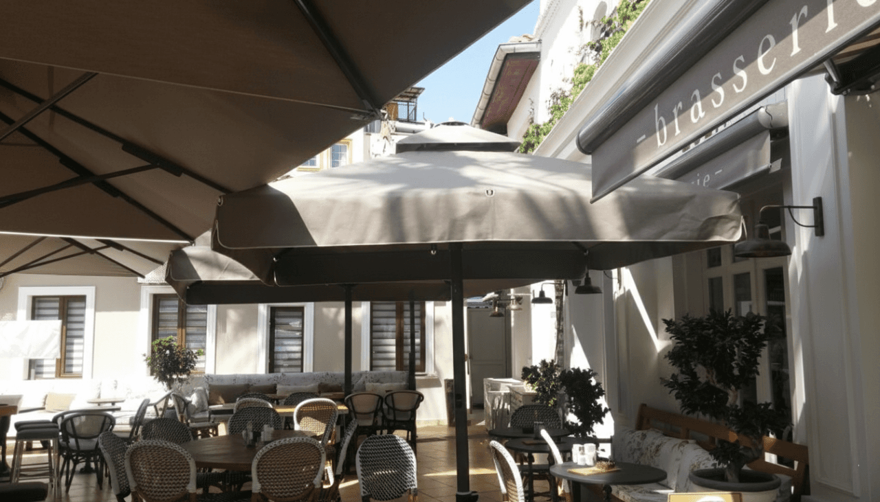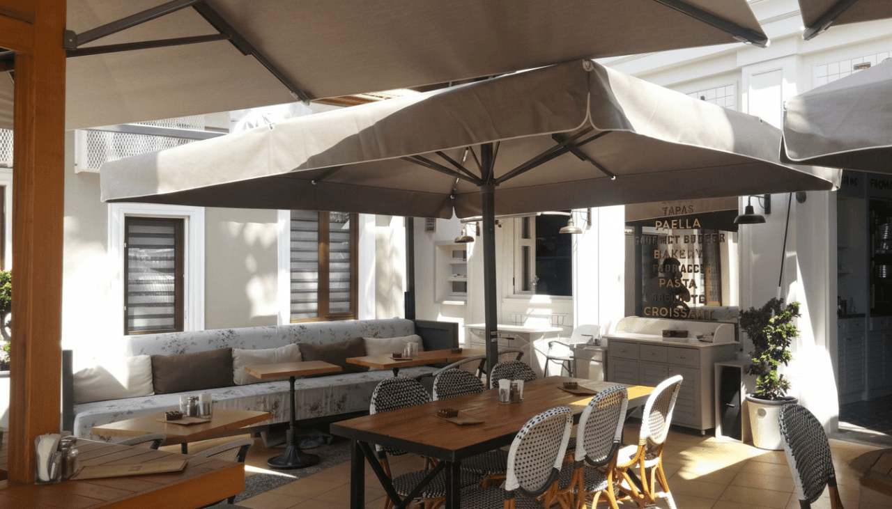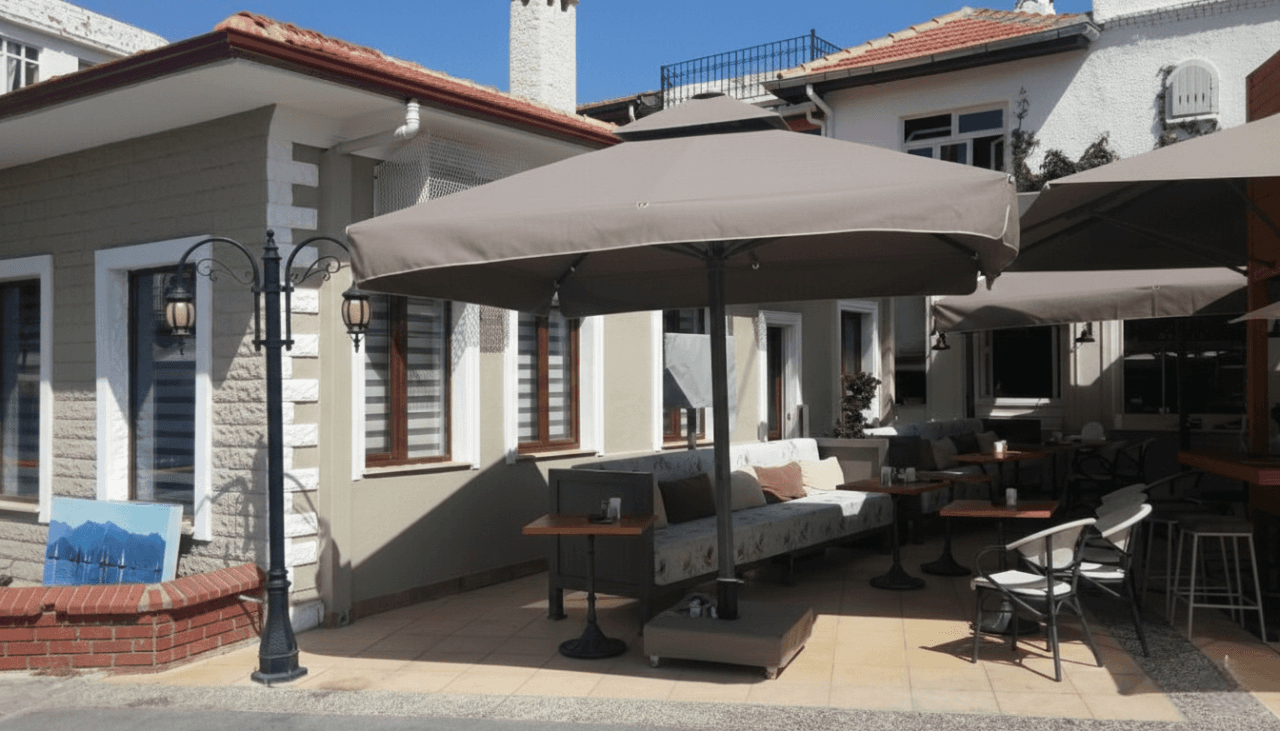 Marmaris’in seçkin noktalarından birinde konumlanan Zola Cafe, açık alanlarında konforu ve mimari bütünlüğü ön planda tutan modern bir mekân anlayışı sunar. Teras ve dış oturma alanlarında tercih edilen 99 Serisi – 400×400 Kare Şemsiye, geniş kare formu sayesinde çoklu masa düzenlerini tek bir gölgelendirme altında toplayarak ferah, dengeli ve kesintisiz bir kullanım alanı oluşturur. 400×400 ölçüsü, gün boyu değişen güneş açılarına karşı homojen gölge sağlayarak misafir deneyimini üst seviyeye taşır. 99 mm çapındaki güçlü orta borusu ve tamamen alüminyum taşıyıcı yapısıyla öne çıkan 99 Serisi, büyük açıklıklarda dahi maksimum stabilite sunar. Teleskopik kapanma mekanizması sayesinde şemsiye kapatılırken masa ve mobilyalara temas etmeden konforlu bir kullanım sağlanır. Tepe bölümünde yer alan havalandırma sistemi açık alanlarda dengeli bir hava sirkülasyonu oluştururken; Zola Cafe’nin atmosferini fonksiyonel biçimde tamamlar.