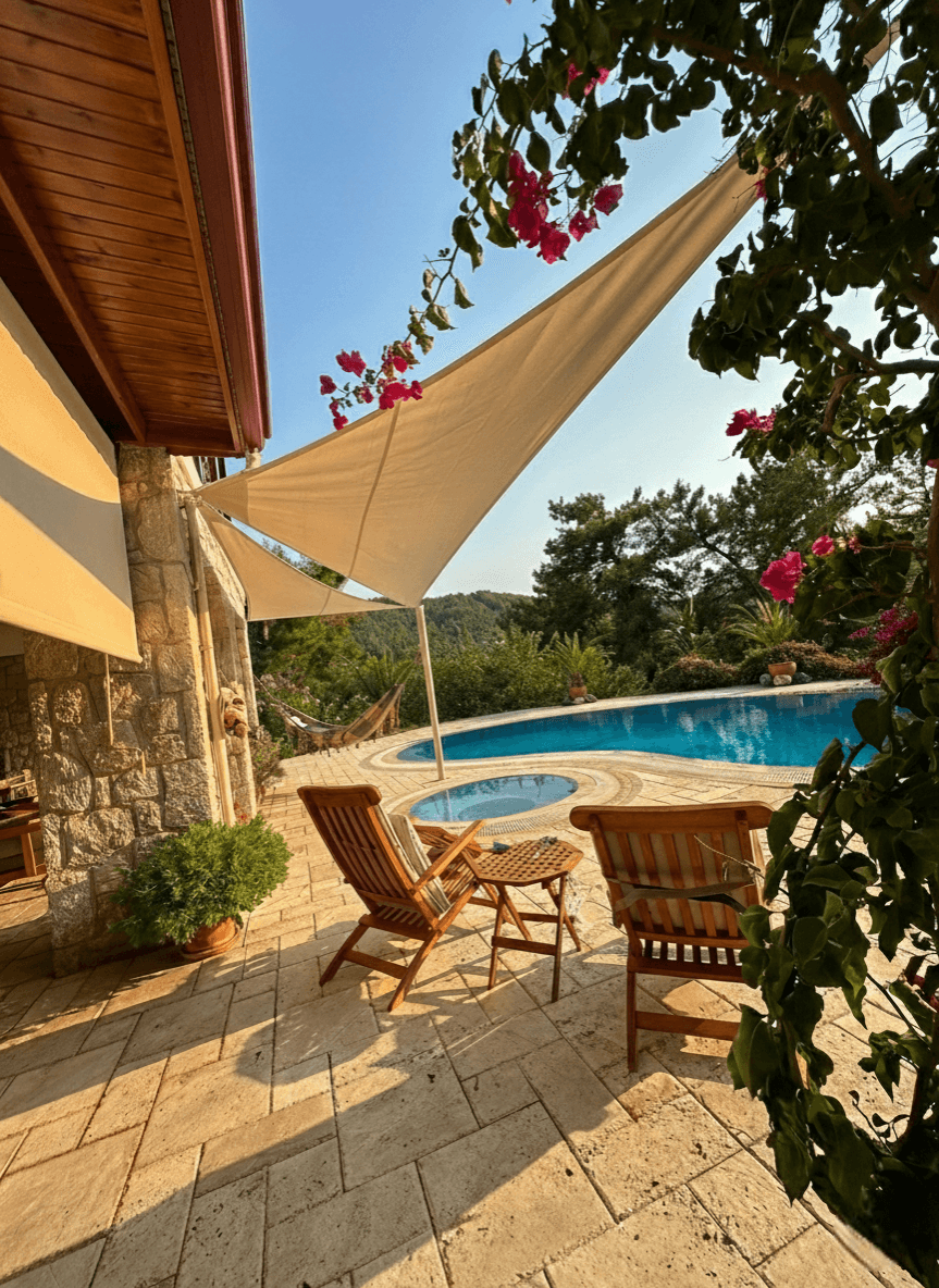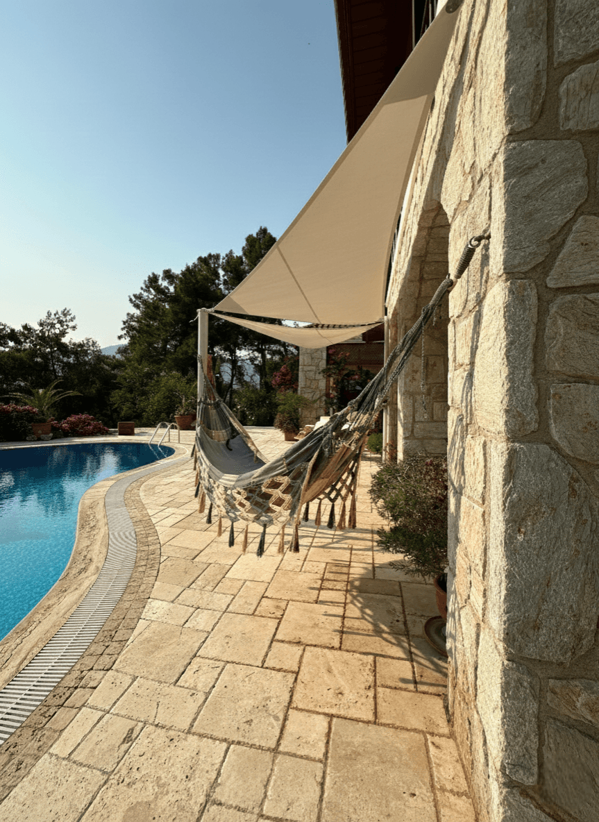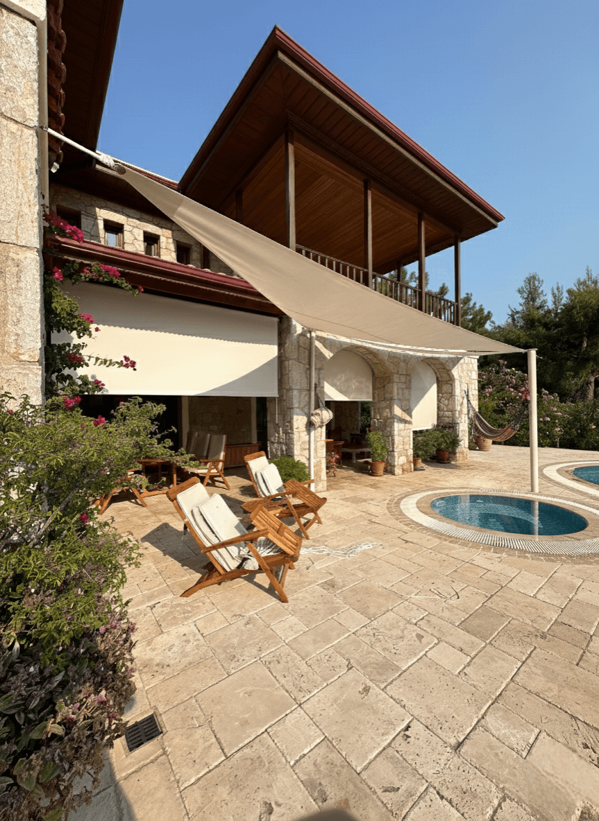 Muğla Akyaka’ nın huzurlu atmosferinde yer alan bu özel konutun havuz başı alanı için, hem fonksiyonel bir gölgelendirme hem de modern bir görsel estetik sunan Yarasa Tente projemizi hayata geçirdik. Konutun genel mimarisiyle bütünleşen bu tasarımda, güneş kontrolünü en üst seviyeye çıkarmak amacıyla ithal akrilik kumaş tercih ettik. Akyaka’ nın değişken rüzgar yükü ve havuz kenarının yüksek güneş etkisi dikkate alınarak, Selçuk Tente kalite standartlarında şu teknik detaylar uygulanmıştır: