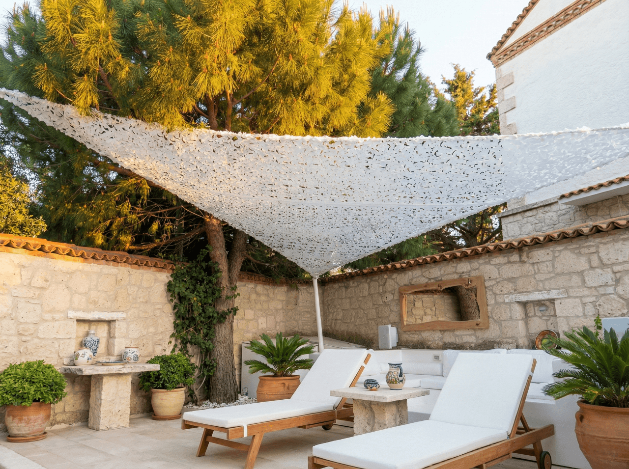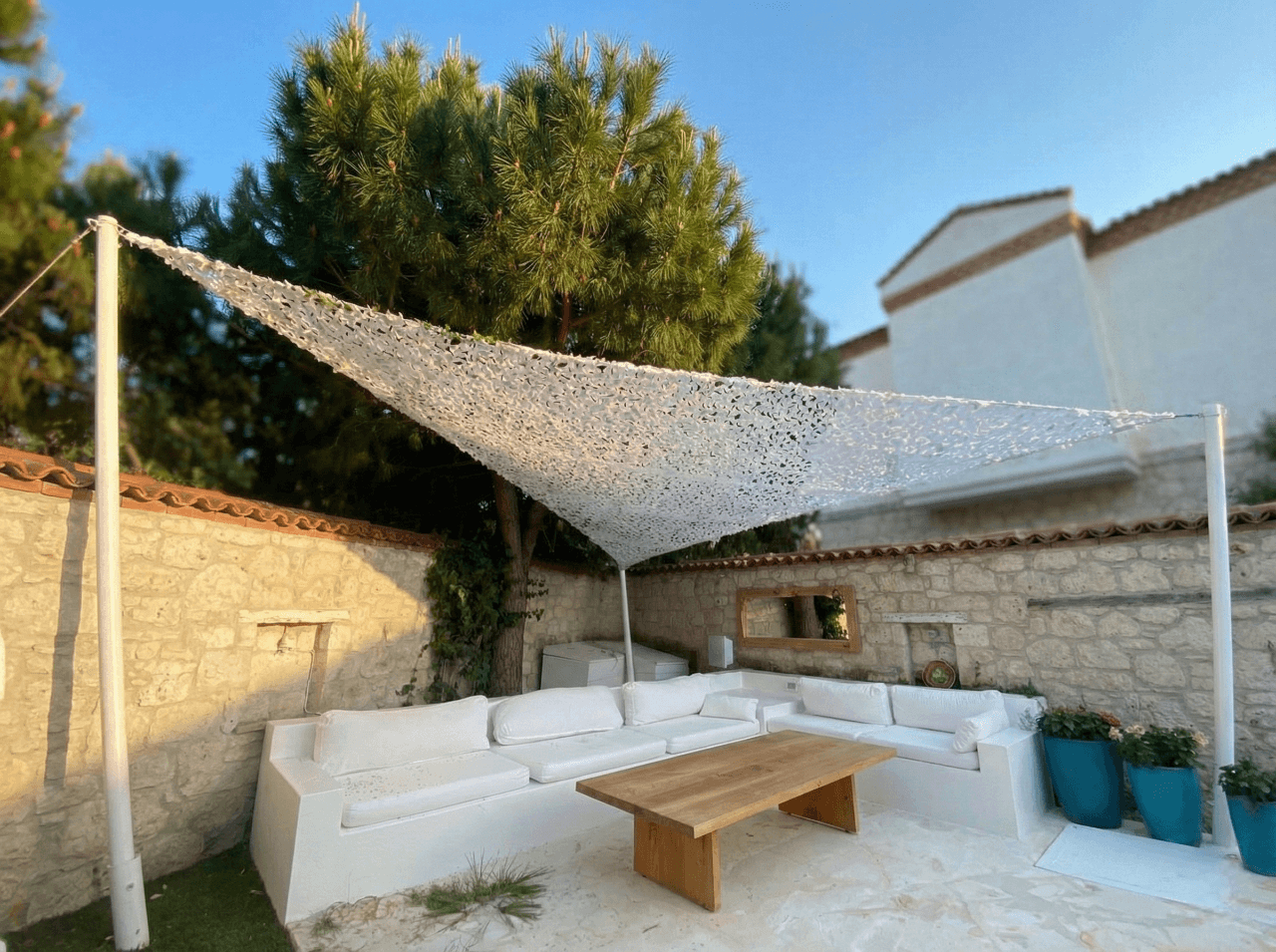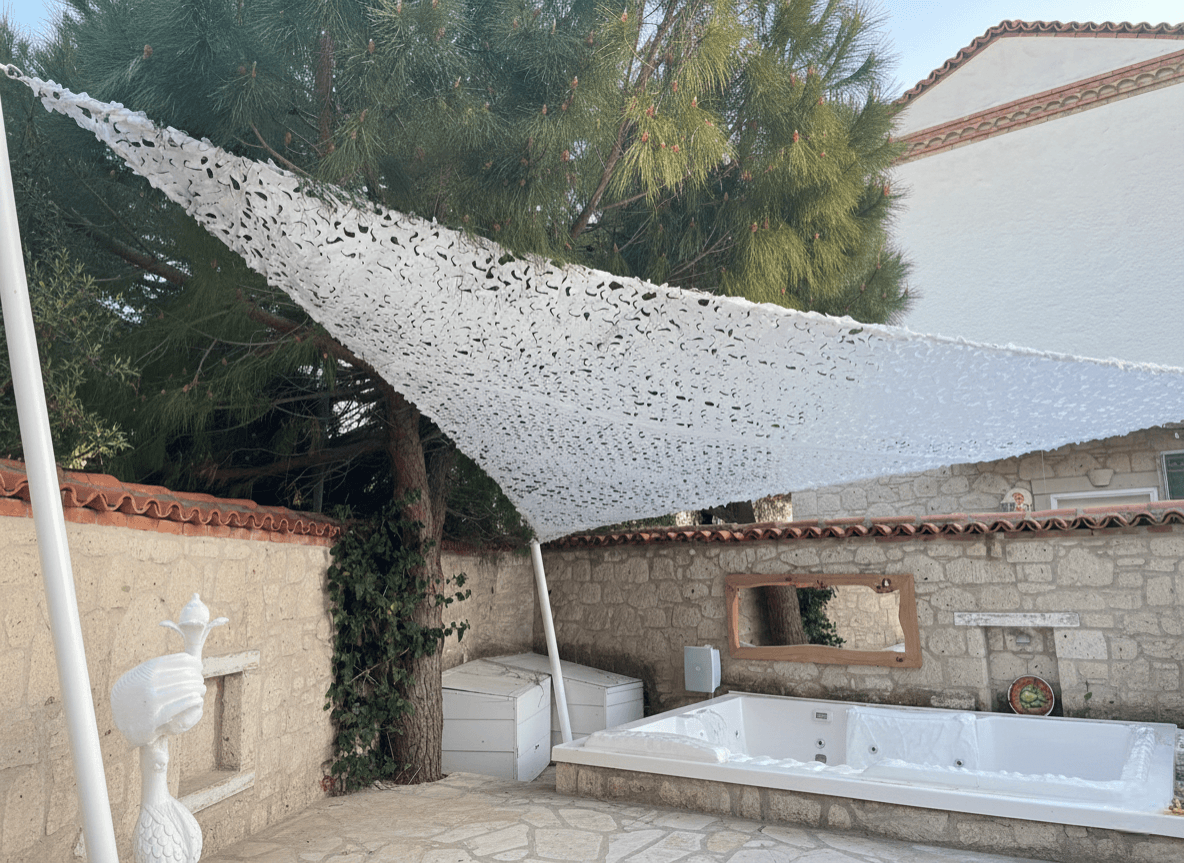 İzmir Alaçatı’ nın karakteristik dokusuna ve modern bahçe tasarımına sahip bu özel konutta, dış mekan oturma grubunu mimari birer odak noktasına dönüştürdük. Alaçatı’ nın parlayan güneşi ve meşhur rüzgarı altında keyifli bir mola alanı yaratmak amacıyla, projemizde Yarasa Tente sistemimizi beyaz kamuflaj kumaş tercihiyle hayata geçirdik. Bu özel tasarım, bahçe dekorasyonuna sanatsal bir derinlik katarken, beyaz kamuflaj kumaşın delikli yapısı sayesinde güneş ışığını yumuşatarak ferah bir gölge alanı sunar. Selçuk Tente olarak, bu estetik formu en yüksek teknik standartlarla mühürledik: