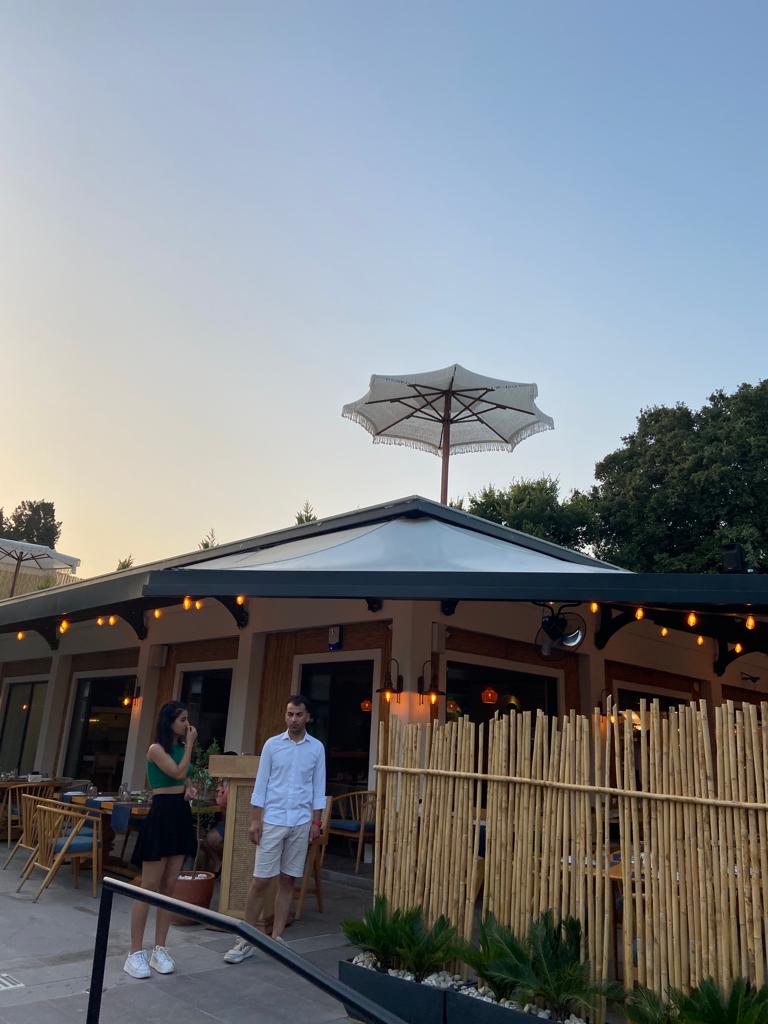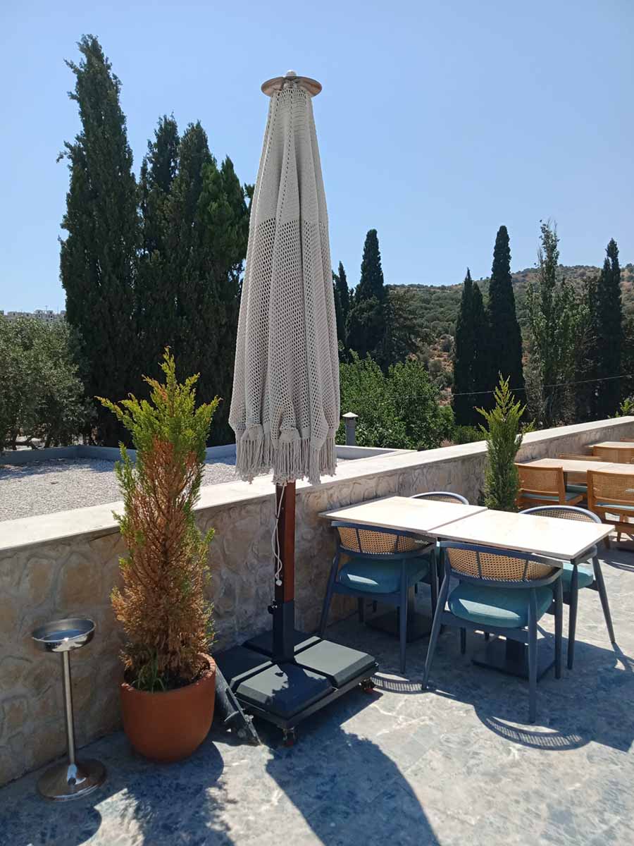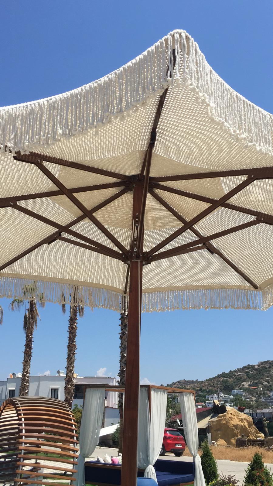 Ortadan direkli ve sekiz kolludur. Orta direk ölçüleri 70x70 Sapella veya İreko ahşap olup kollar özel takviyeli 19x27 mm alüminyumdur. Yük gören bağlantı parçaları komple alüminyum ve elektrostatik boyalıdır.